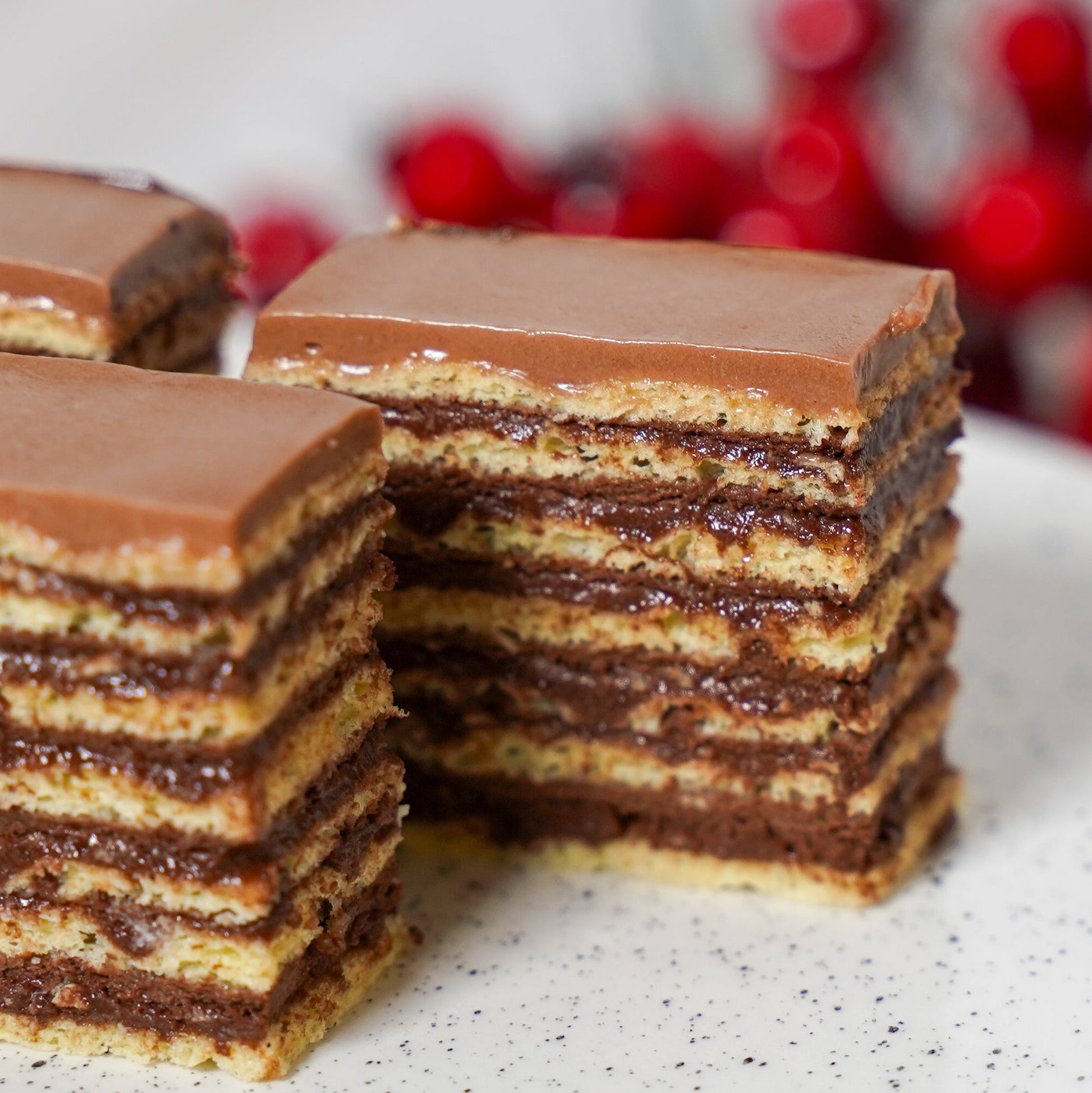 – Doboș, clasicul reinterpretat cu straturi fine și glazură lucioasă de ciocolata belgiană.